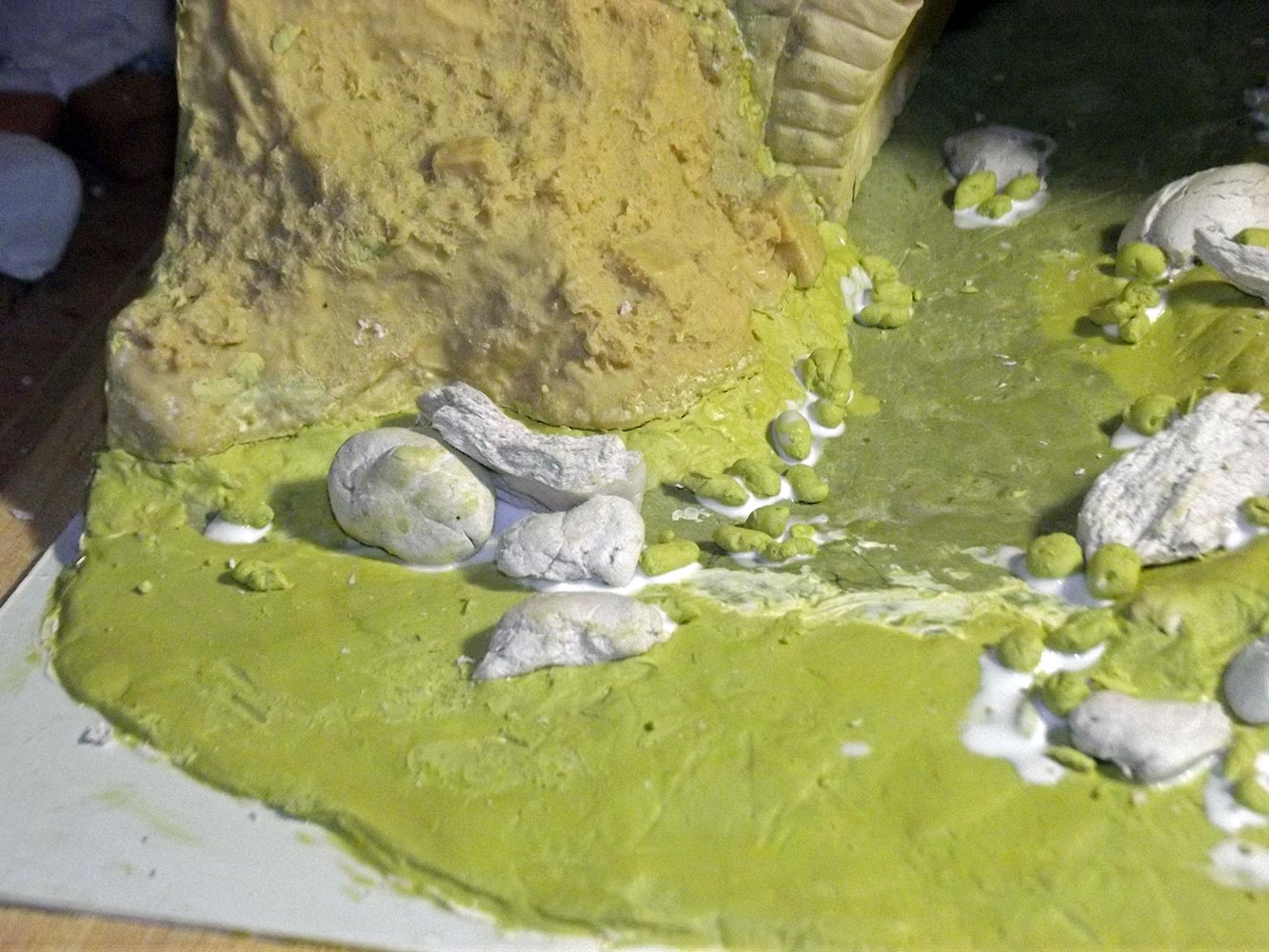 In questa prima parte dell’allestimento, ho utilizzato, per le pietre, Milliput e Das opportunamente sagomati, per i piccoli tronchi in legno, ho utilizzato del Das semisecco, strappato, sfibrato, ottenendo una texture molto realistica ( Foto 35, 36, 37, 38 ). In Foto 39 l’allestimento ancora parziale.