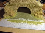 Essendo la dimensione della base in polistirolo ridotta rispetto al progetto, ho provveduto ad estenderla utilizzando un ampio foglio in Plasticard piuttosto spesso, dove ho, prima, incollato la base in polistirolo ( Foto 28 ), estendendo poi il letto del fiume, prima con una pasta leggera per modellismo rinforzata poi con Milliput ( Foto 29, 30 ). In Foto 31, 32, 33, il ponte stuccato e saldato alle scarpate anteriori. In Foto 34 la parte posteriore della base terminata. Il ponte, comunque, non è ancora saldato alla base, per poterlo rimuovere e lavorare su di essa.