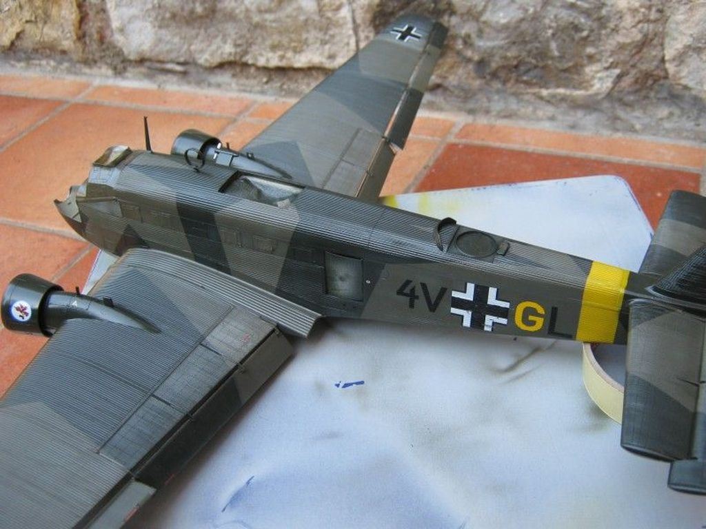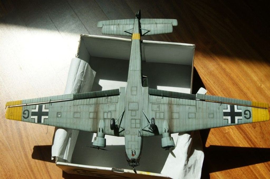 L’aereo, dopo avere ricevuto una mano di lucido con cera Future per sigillare le decals, è stato oggetto di lavaggi ad olio con terra d'ombra bruciata, nero, e grigio di Prussia diluiti in White spirit. Ho immaginato un aereo molto logoro e sporco visto l'estenuante uso, il periodo, il luogo e le condizioni non più favorevoli per la Luftwaffe Una volta asciugati i lavaggi e rimosso l'eccesso, ho steso una mano di opaco a smalto Humbrol, Quindi a modello asciutto dry-brusch acrilici in varie tonalità (anche se ho notato che il miglior risultato di schiaritura me lo ha dato l'RLM02 Gunze H 70) e gessetti da artista "grattugiati" sulla carta vetro e stesi a pennello.