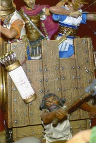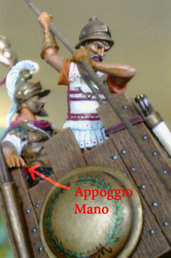 I 3 personaggi da inserire nella torretta, dovranno essere assemblati correttamente, perché lo spazio a disposizione per la loro collocazione è minimo. Quindi vi consiglio di essere molto precisi e di provare a secco prima della pitturazione la loro disposizione, ponete attenzione al comandante cartaginese, perché la sua mano dx appoggerà sull'angolo posteriore della torretta, lo stesso dicasi per l'arciere, il suo busto dovrà appoggiare perfettamente, io qui ho fatto una piccolissima modifica, a me piaceva che lo stesso tirasse in basso, come se stesse mirando un romano a piedi, la figura in origine tende a puntare verso l'alto.