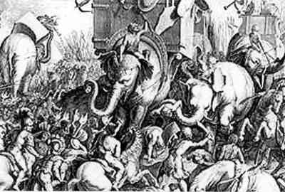 Addentriamoci adesso ad analizzare tutto l'insieme e facendo presente che non sono un artista, desidero solo poter dare qualche consiglio in base alle difficoltà incontrate durante l'assemblaggio: la riproduzione della battaglia eseguita dalla ANDREA MINIATURES è, come di consuetudine, di ottima fattura. Aprendo la scatola ci troviamo di fronte una grande quantità di pezzi, che potrebbero scoraggiare anche il più incallito modellista, ma successivamente si è attratti dalla maestosità del pachiderma. L'Elefante è fuso in 9 parti, le due metà del corpo dx + sx con relative zampe, la testa, le due orecchie, la coda e le due zanne.
